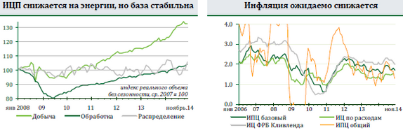 Очередные макропрогнозы ФРС заметно отличались от сентябрьских только более низким уровнем безработицы на следующие 2 года. Базовая инфляция, по мнению ФРС, останется ниже 2% на всем горизонте прогнозирования. Промышленное производство в ноябре ускорилось до 1,3%мм и 5,2%гг. Обработка прибавила 1,1%, распределение выросло на 5,1%, а добыча притормозила, показав снижение выпуска второй месяц подряд -0,1% посте октябрьских -1,0%. Замедление добычи ожидется и дальше по мере того как будет сказываться эффект резкого падения мировых цен на нефть, но вес сектора в промышленности - только 15,9%.